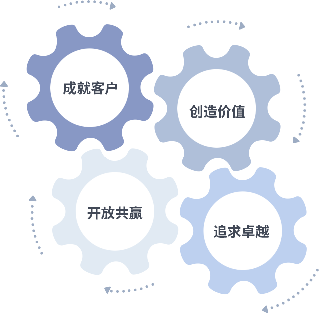 成就客户是一切决策的出发点,创造价值是衡量所有工作的标准,追求卓越是亿博电竞做事做人的态度,开放共赢是亿博电竞的格局也是最终的结果。价值观的齿轮环环相扣,推动着组织里的每个人不断向前。